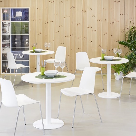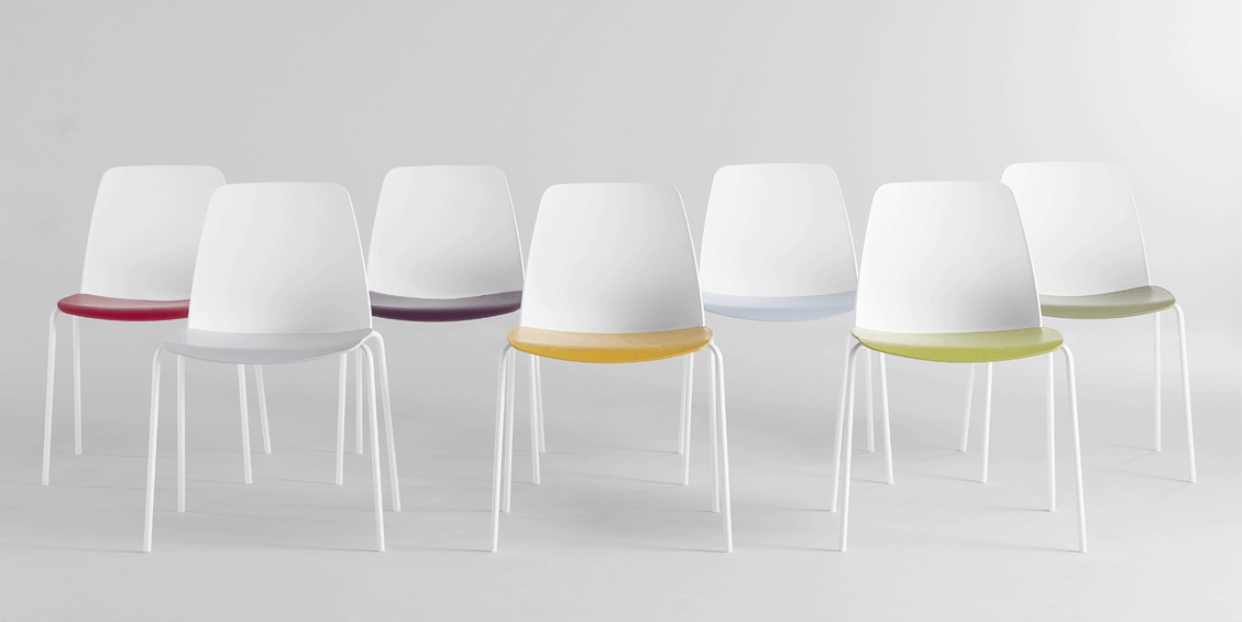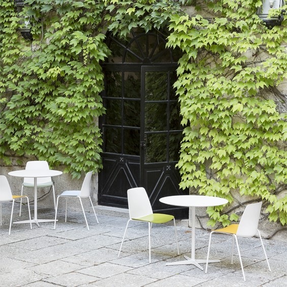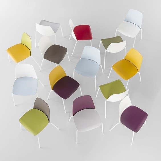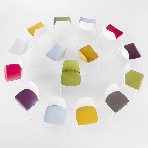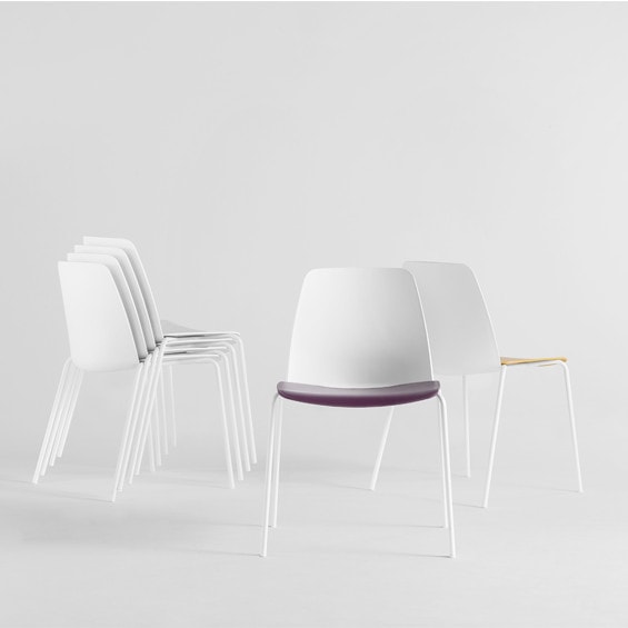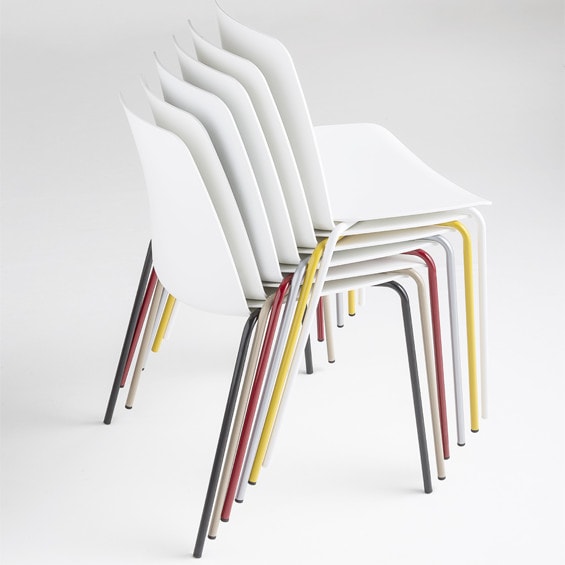 Stackable side chair with seat and back in polypropylene on four leg steel base. Stacks 10 on floor and 15 on a trolley.