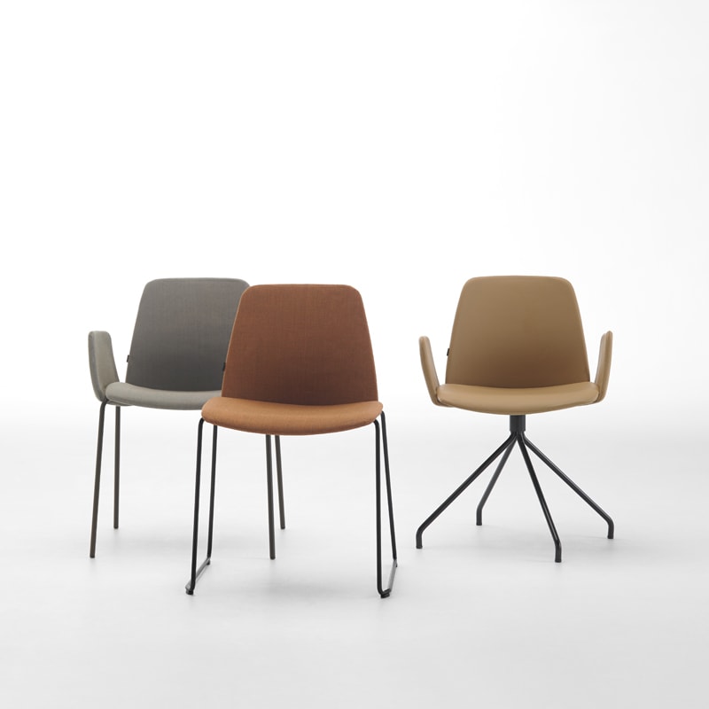 Stackable fully upholstered side chair on steel sled base. Stacks 8 on floor and 12 on a trolley.