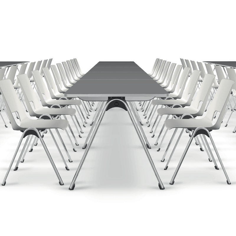 Stackable table on a chrome frame with black glides. Stacks vertically.