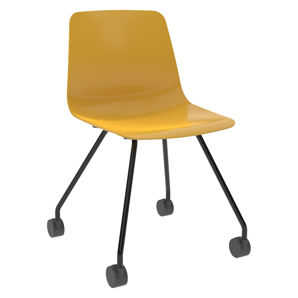 Side chair with seat and back in polypropylene on a 4 leg epoxy coated base with casters.