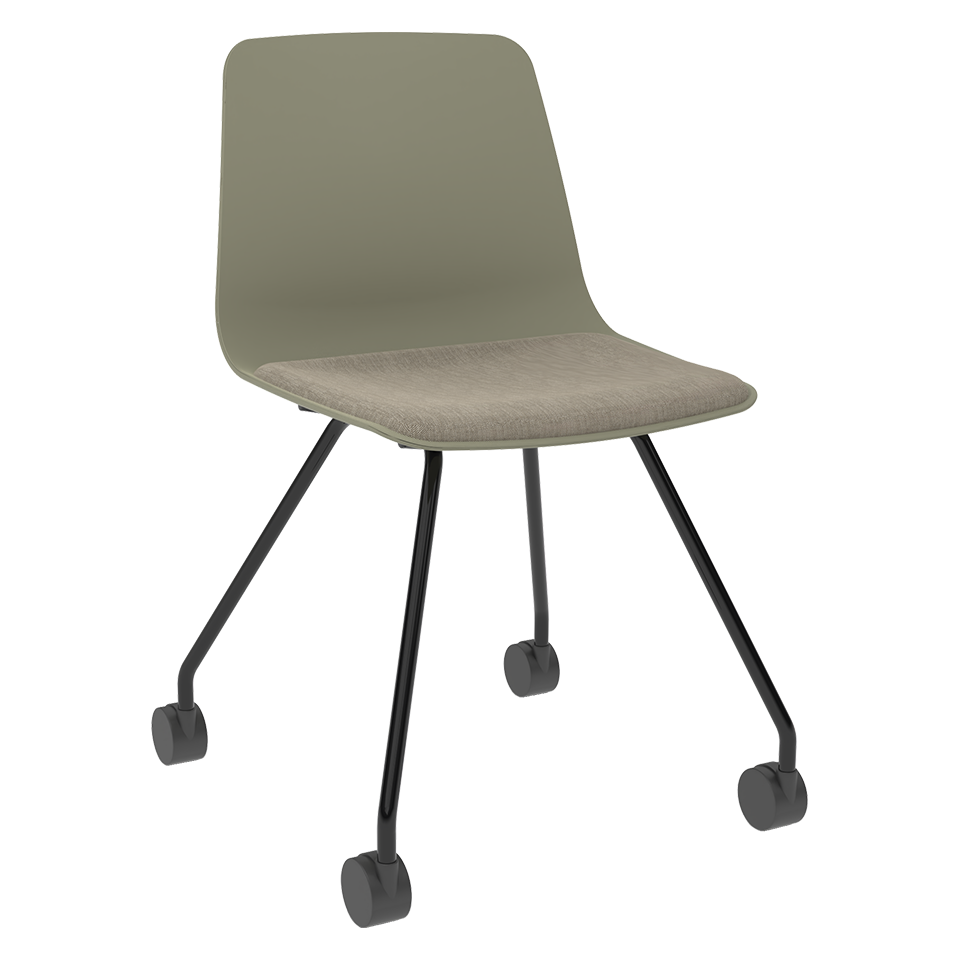 Side chair with upholstered seat and back in polypropylene on a 4 leg epoxy coated base with casters.