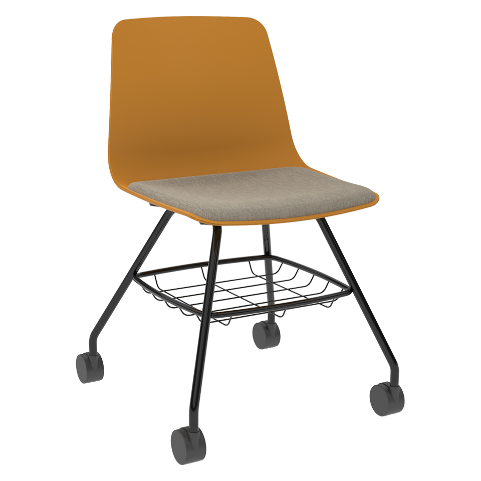 Side chair with polypropylene seat and back with seat cushion on a 4 leg epoxy coated base with casters and a basket.