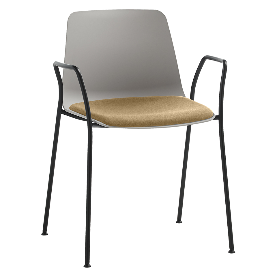 Armchair with upholstered seat and polypropylene back on a four-leg steel base.
