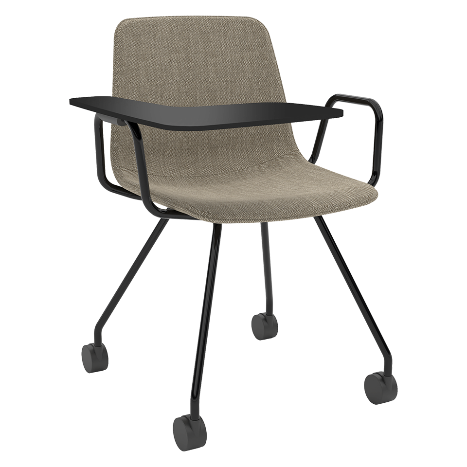 Upholstered armchair with right tablet arm and left metallic arm on a 4 leg epoxy coated base with casters.