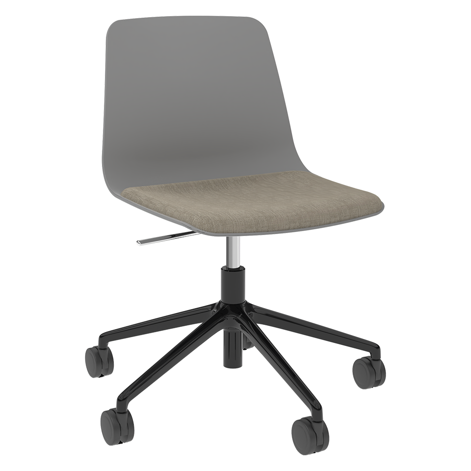 Swivel chair with upholstered seat pad, on polypropylene shell and 5-spoke cast aluminum swivel base fitted with 65mm soft tread casters. The seat height is adjustable.