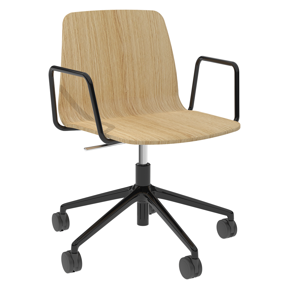 Swivel armchair with wooden shell and 5-spoke cast aluminum swivel base fitted with 65mm soft tread casters.