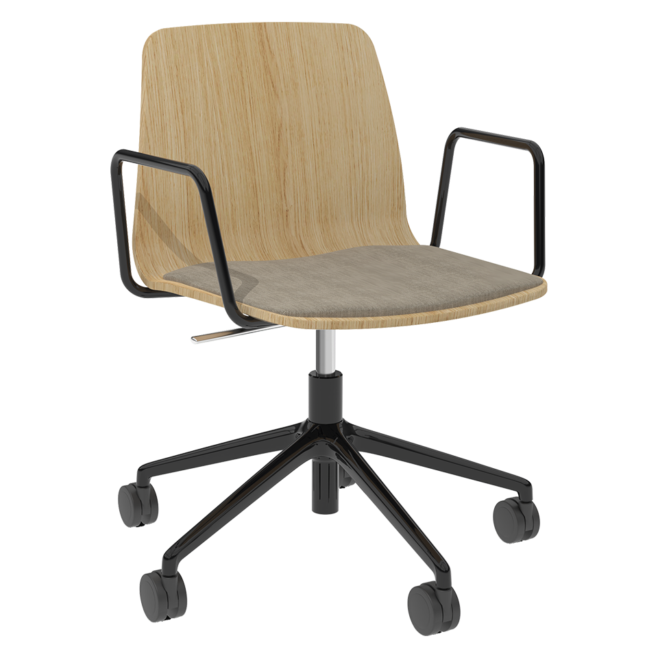 Swivel armchair with upholstered seat pad, on wooden shell and 5-spoke cast aluminum swivel base fitted with 65mm soft tread casters. The seat height is adjustable.