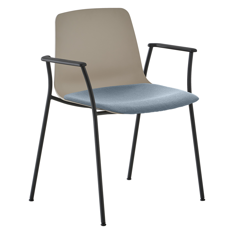 Stackable armchair with polypropylene shell and upholstered seat. Aluminum armpads and round steel tube 4 leg frame. Greenguard Gold Certified.