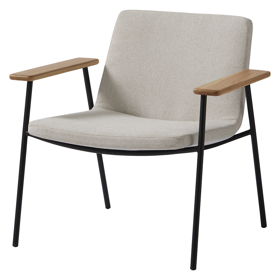 Lounge armchair with low backrest, 4-leg frame and wooden arms with upholstered seat shell.
