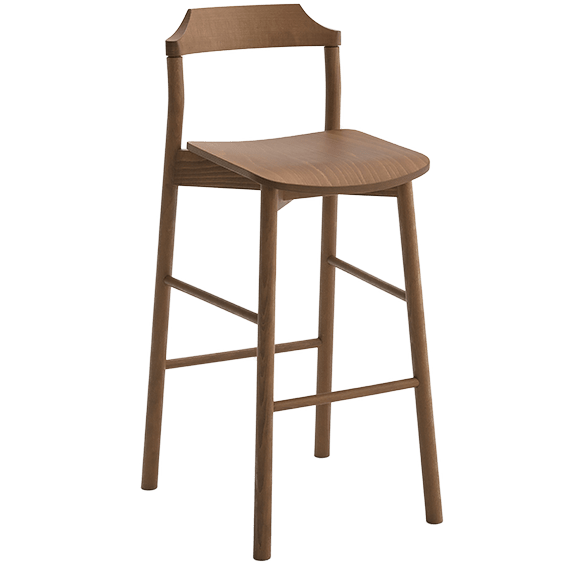 Barstool with a seat, back, and frame in solid beech wood fitted with a stainless steel kick-plate on the front footrest.