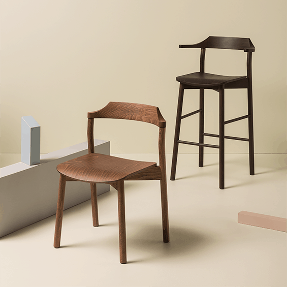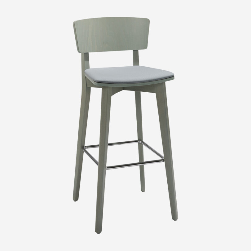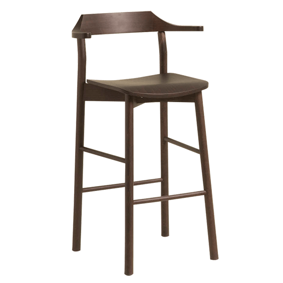 Barstool with a solid beech finish and armrests fitted with a stainless steel kick-plate on the front footrest.