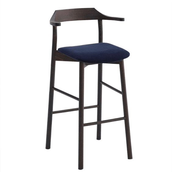 Barstool with an upholstered seat on a solid beech frame with armrests. Fitted with a stainless steel kick-plate on the front footrest.
