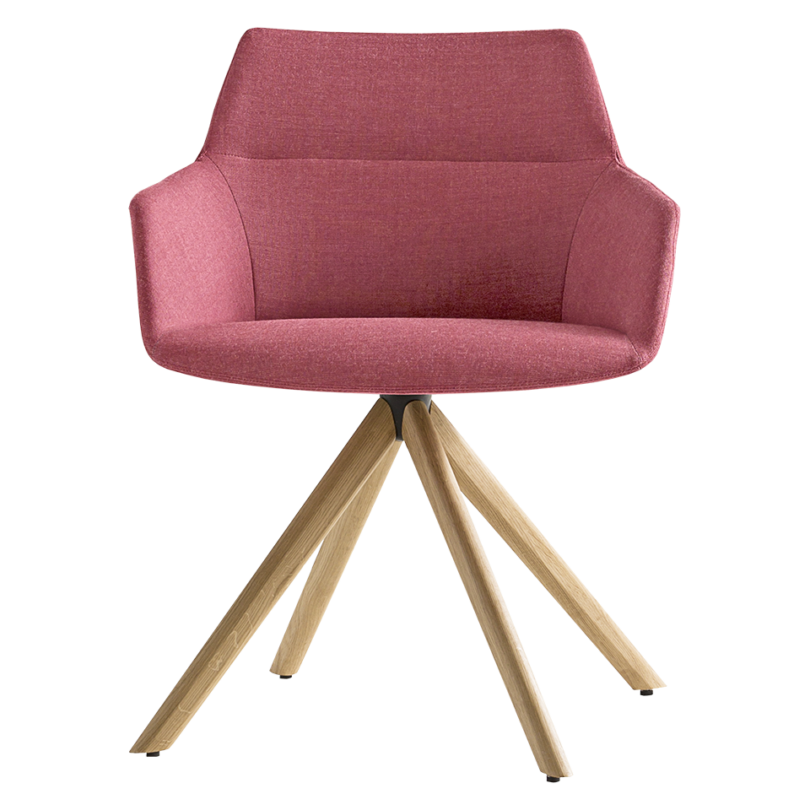 Fully upholstered arm chair on wooden base. 360o swivel seat with no return mechanism. Greenguard Certified.