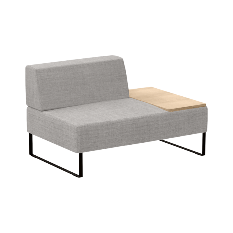 Upholstered modular seat W.47.2″ with right side backrest W.31.5″, left table W.15.7″ and steel plate legs.
