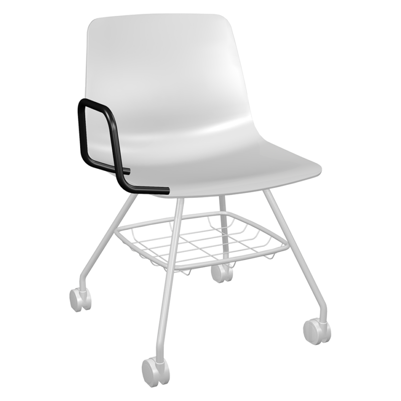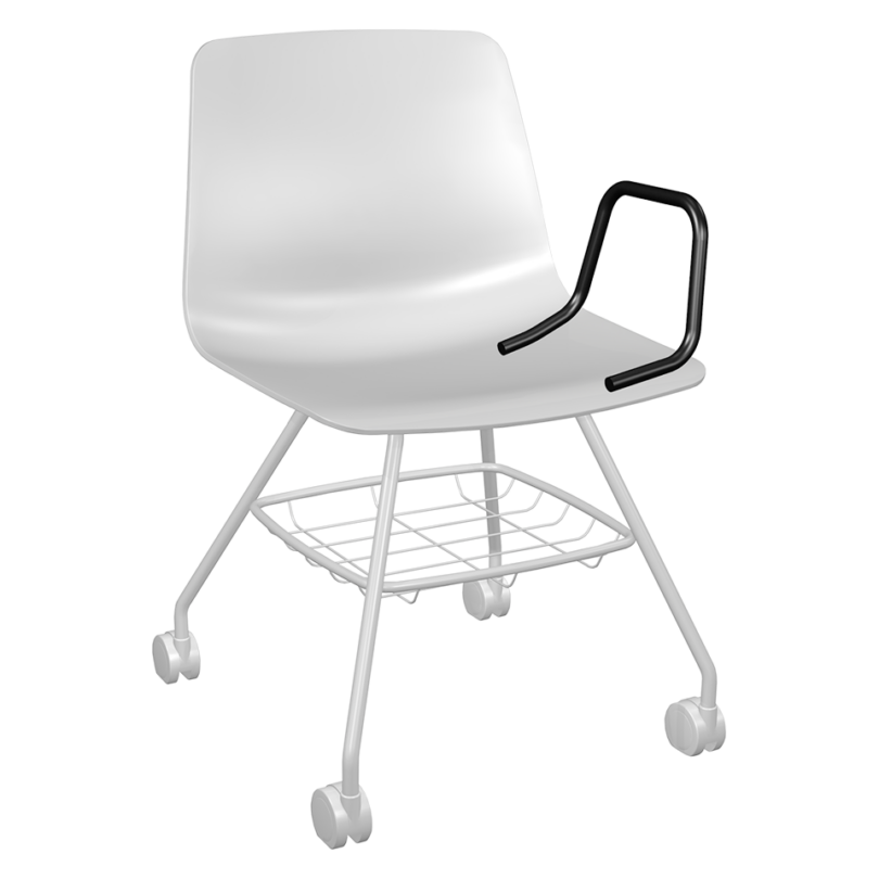 Stackable armchair with polypropylene seat shell, aluminum armpads and round steel tube 4 leg frame. Greenguard Gold Certified.
