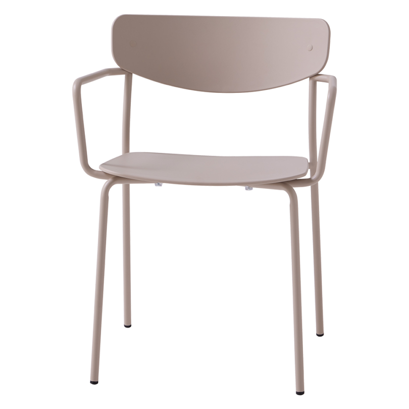 Stackable armchair with seat and back in polypropylene. Four leg frame with arms in round steel tube.