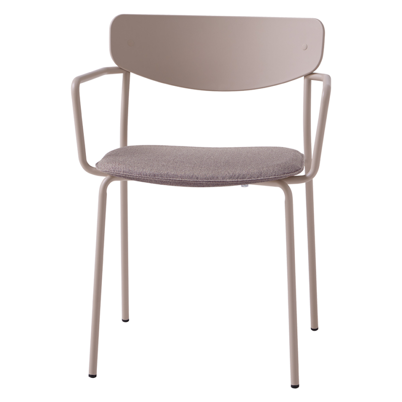 Stackable armchair with upholstered seat, polypropylene back and armpads. Four leg frame with arms in round steel tube.