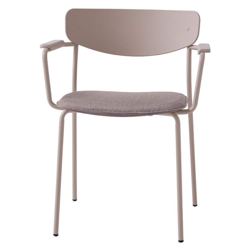 Armchair with recycled polypropylene seat on a powder coated or chromium plated tubular steel frame, with upholstered seat pad. Stackable and linkable (armchair-chair-armchair)