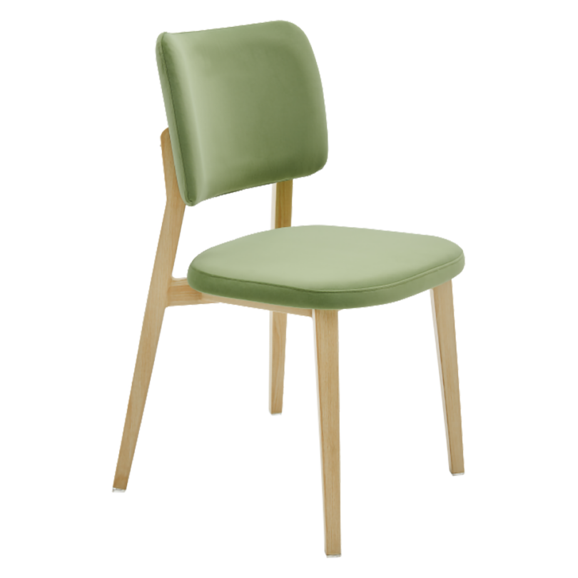 Side chair with upholstered seat and frame in natural beech. NOT STACKABLE