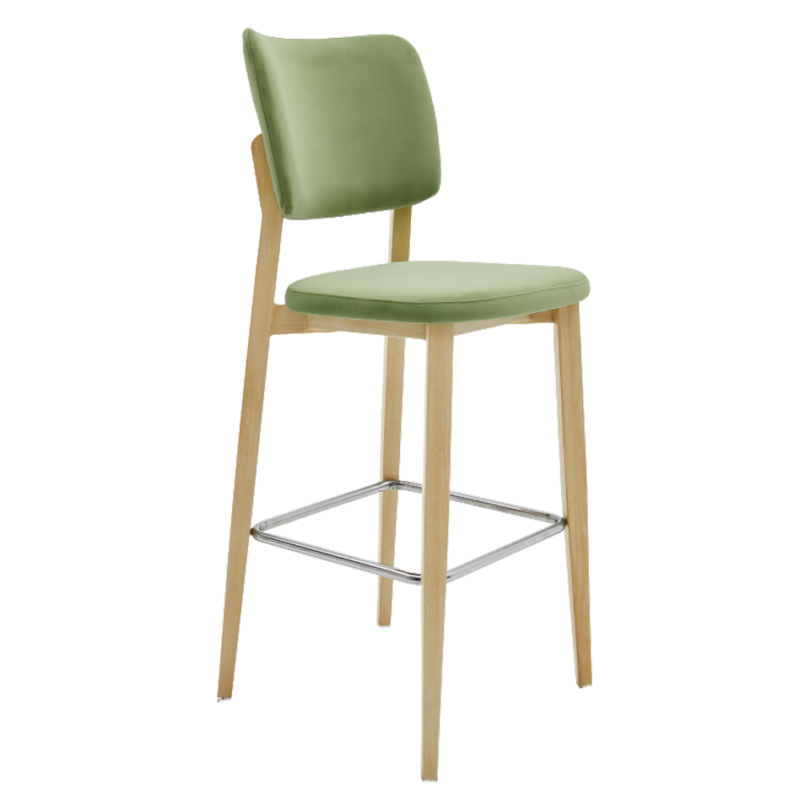 Upholstered counter stool with plain upholstery on solid wood frame. Footrest in chrome or brass, 24″ seat height