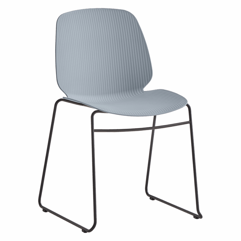 Stacking side chair on sled base with epoxy special color coated steel frame and polypropylene shell.