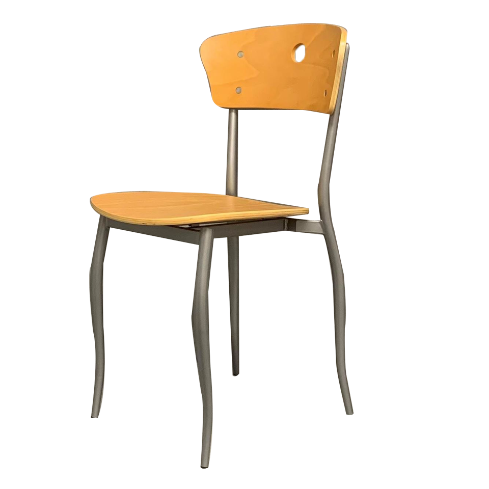 [description] => Stackable side chair, steel frame and wooden seat and back.