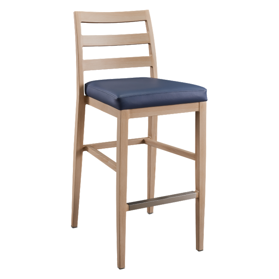 Woodlook barstool with frame manufactured entirely from aluminum but with realistic appearance of wood. Lightweight and highly scratch resistant.