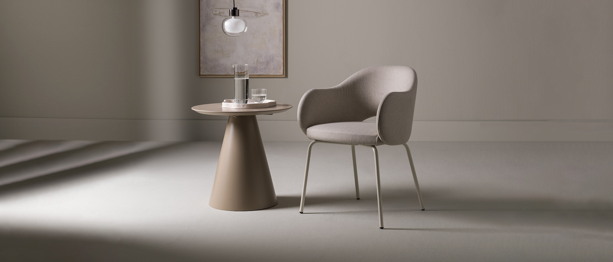 An elegant armchair with an opening between the back and seat. The backrest seamlessly flows into the armrests, making for a comfortable, fully-upholstered chair.