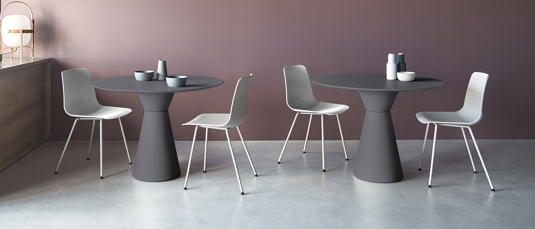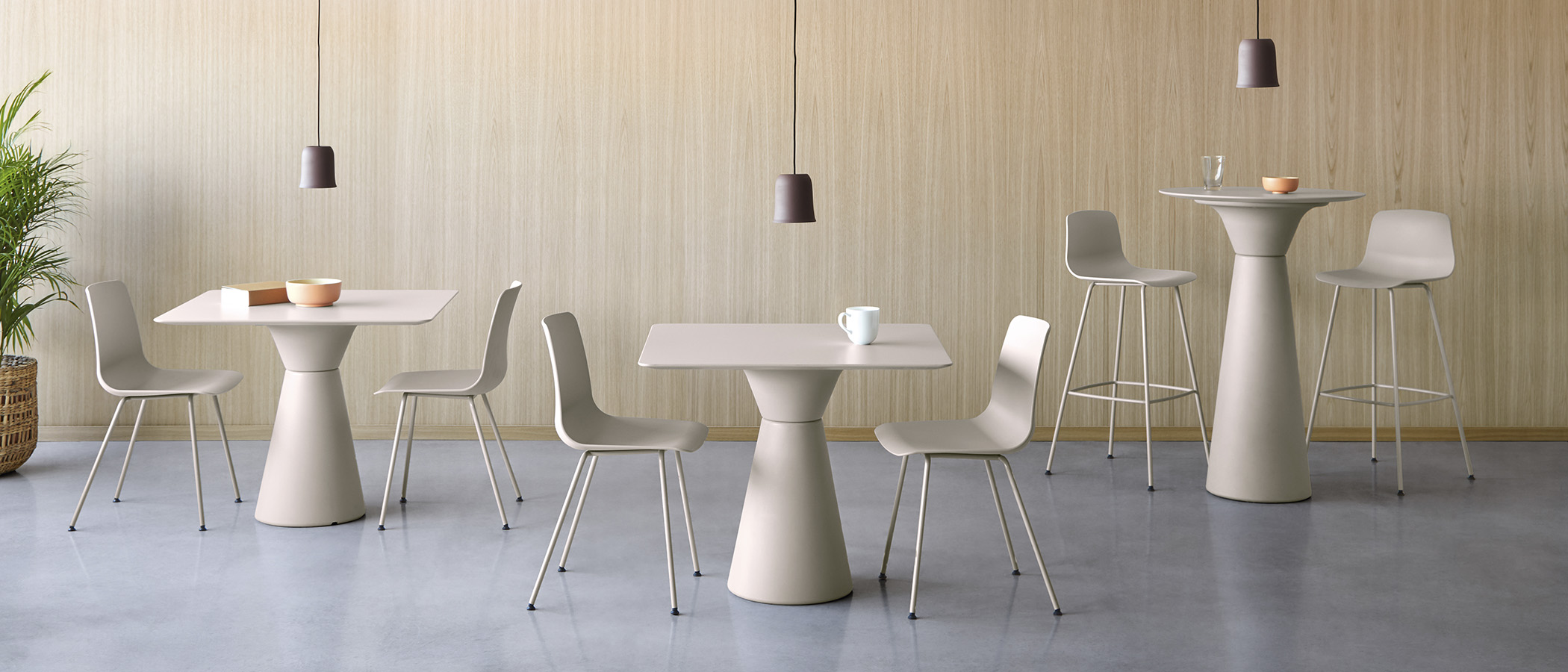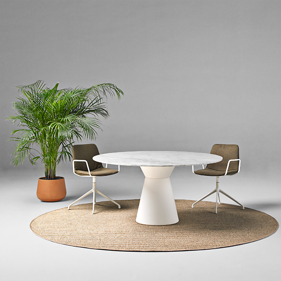 These commercial-grade tables feature a striking, sculptural base that is 100% recyclable, making Essens a good choice for restaurants and meeting rooms alike. To suit various hospitality and office environments, it is available in occasional, standard, and bar heights, and with a wide range of tabletop materials. Suitable for outdoors in certain finishes.