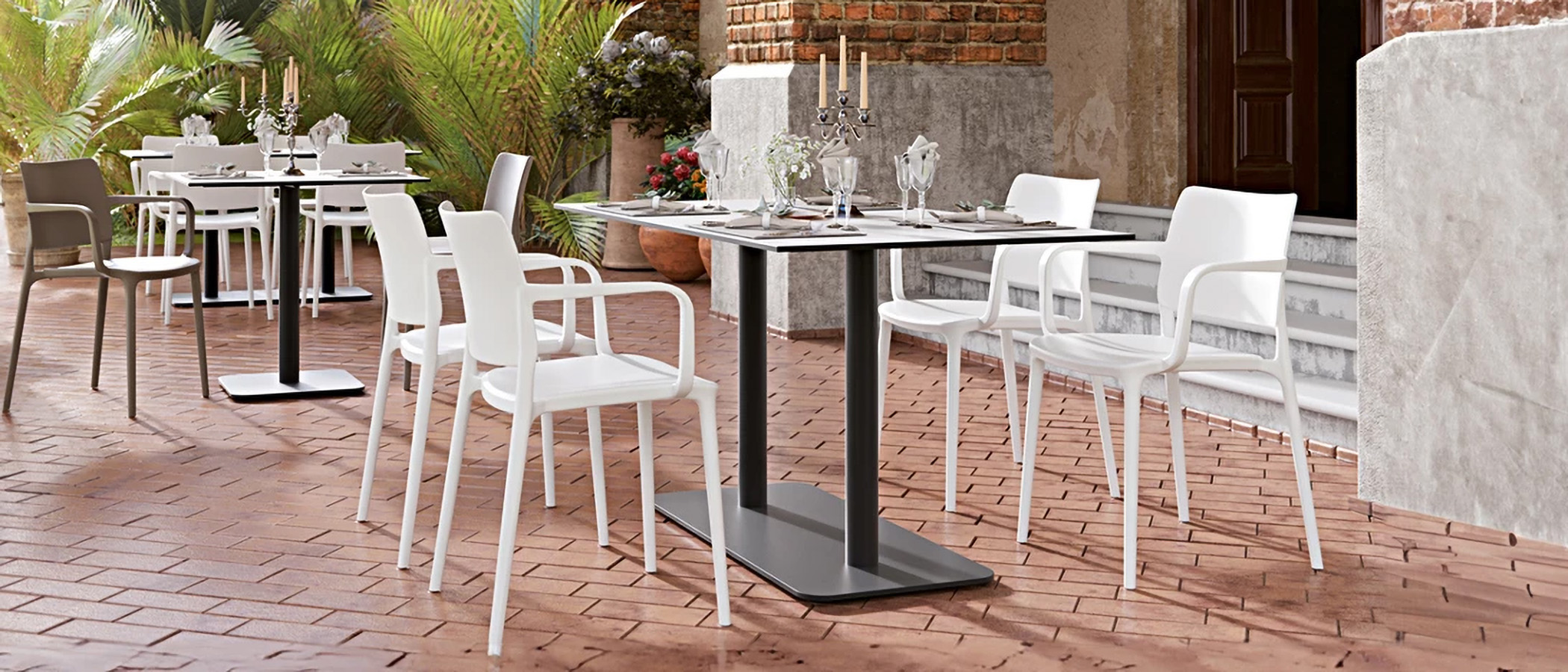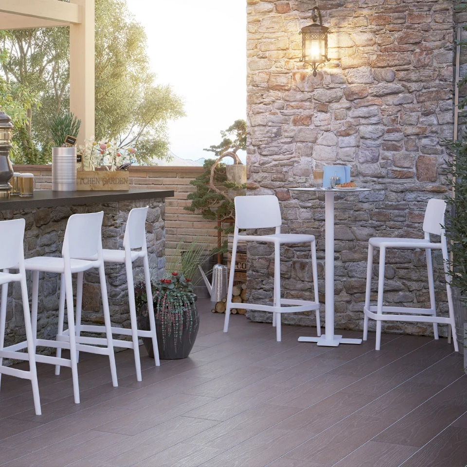 These classic outdoor chairs and stools are stackable. The polypropylene is reinforced with fiberglass for enhanced durability.