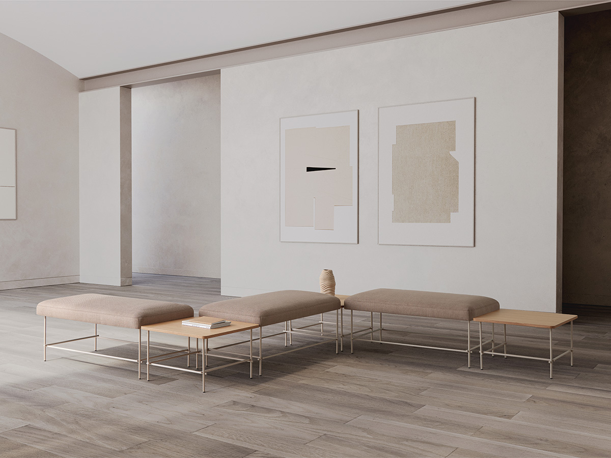 A modular range featuring benches, occasional tables, ottomans, and an elegant 'knot' detail on the legs.