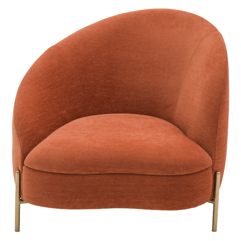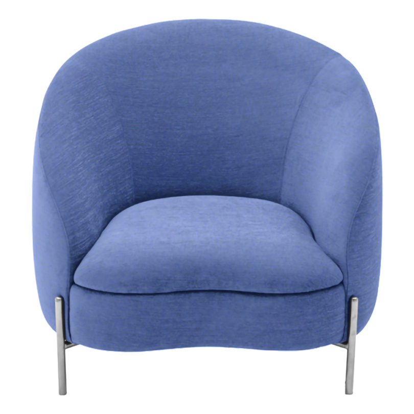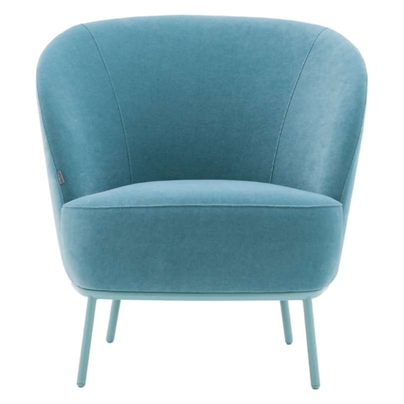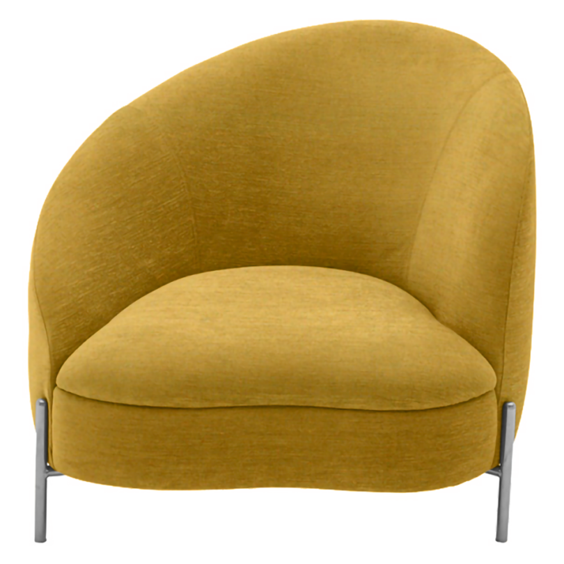 Lounge chair with plywood seat frame. Back made out of molded foam. Seat upholstered in two parts. Back upholstered onto the frame. With round metal legs.