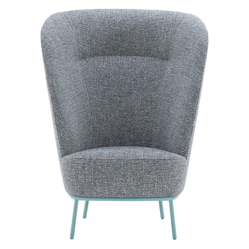 Lounge high-back armchair, plywood beech shell. Webbed seat. Upholstered onto the frame. Metal frame and legs.