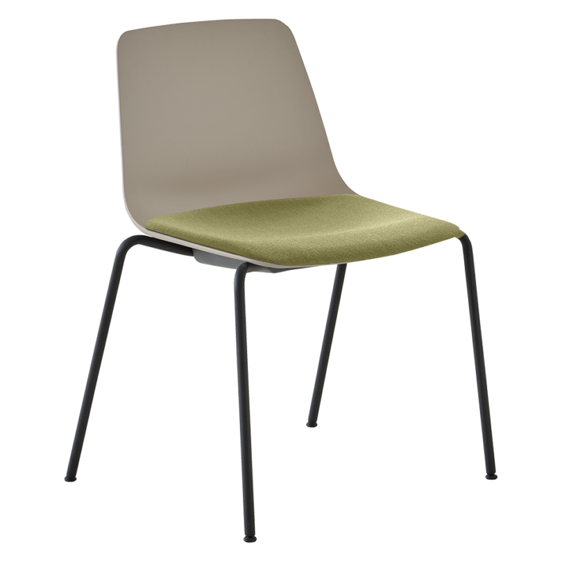 Side chair with polypropylene shell and upholstered seat with round steel tube 4 leg frame. Greenguard Certified.