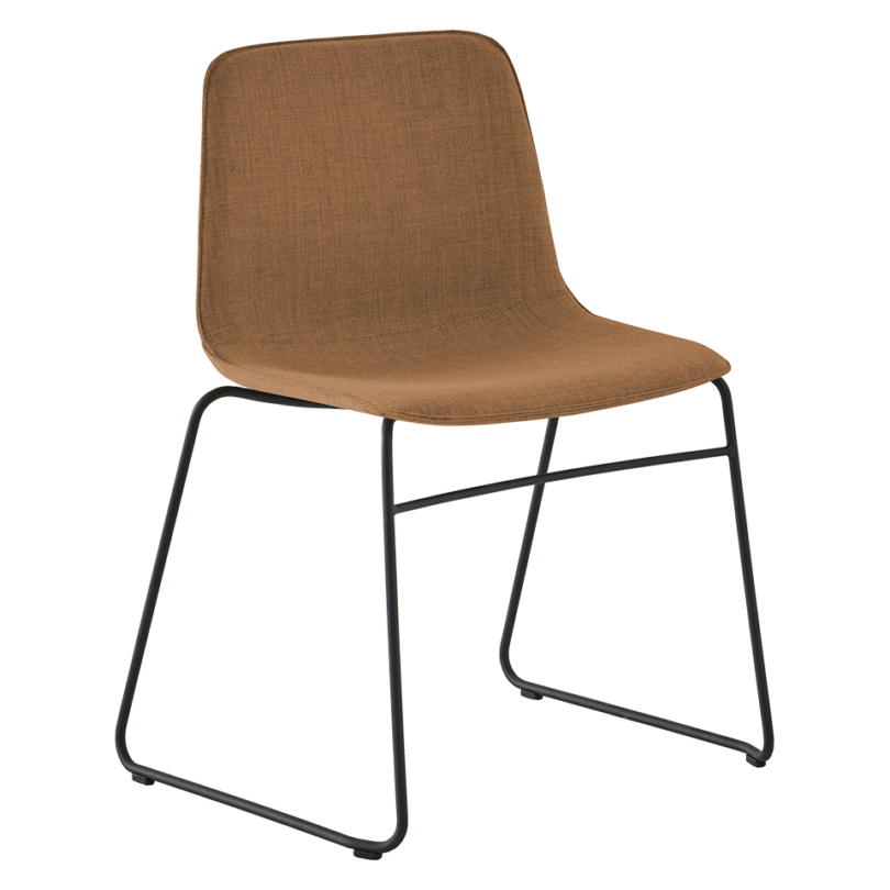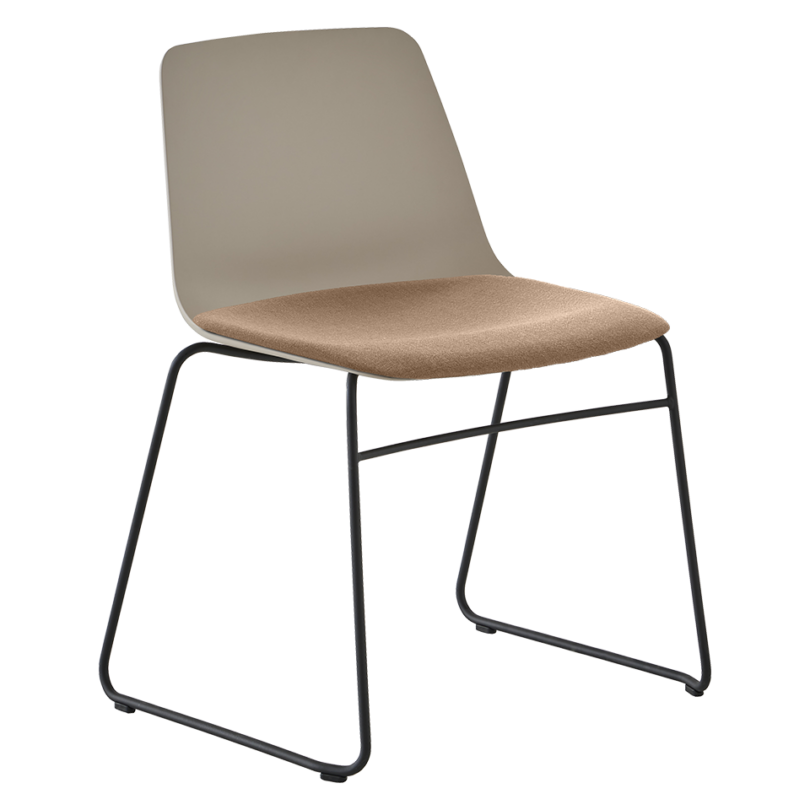 Stackable chair with polypropylene shell and upholstered seat with steel round rod sled frame. Greenguard Certified.