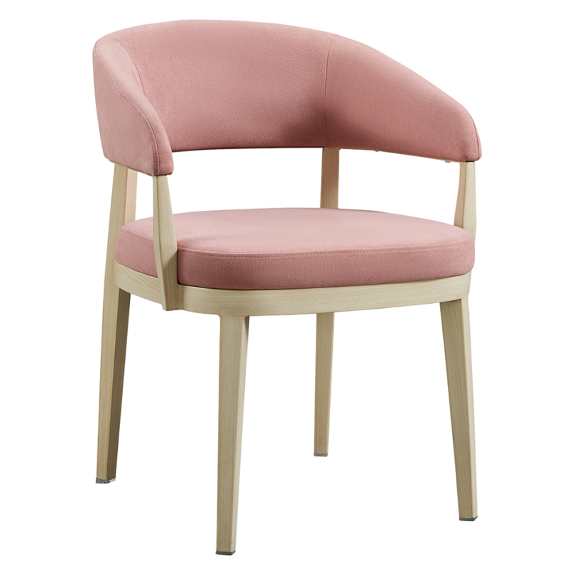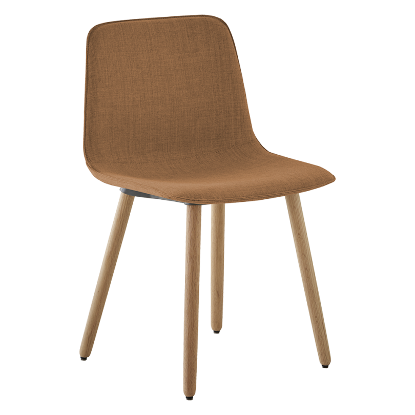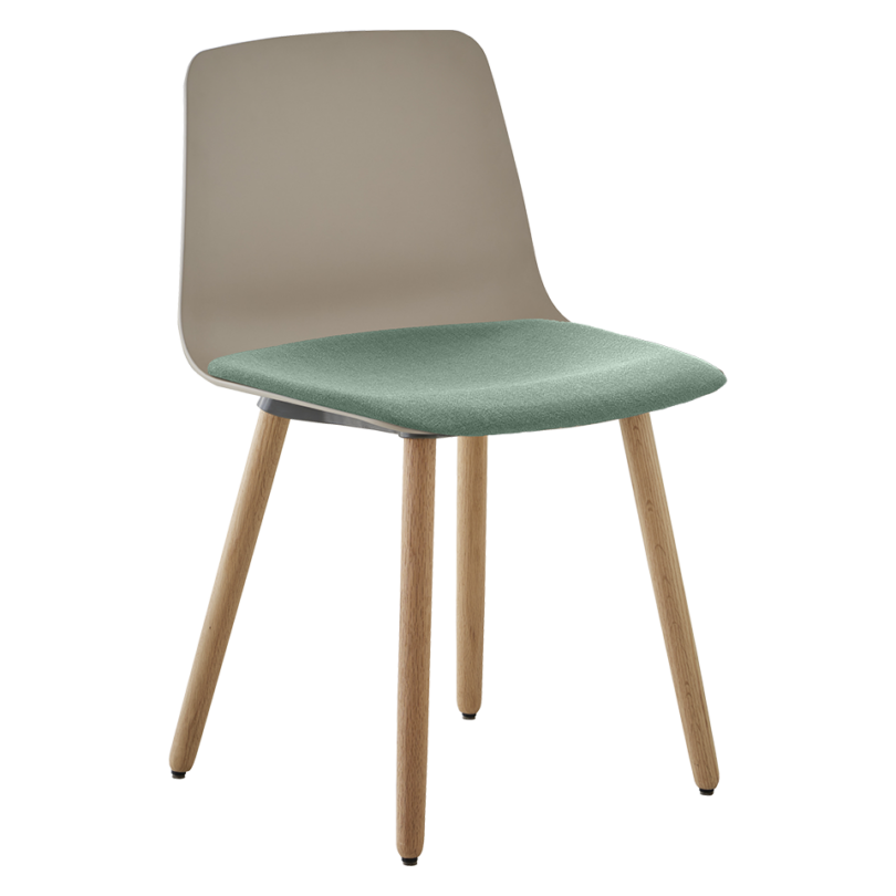 Chair with polypropylene shell and upholstered seat on a four leg frame in solid oak, reinforced with an inner steel structure. Greenguard Certified.