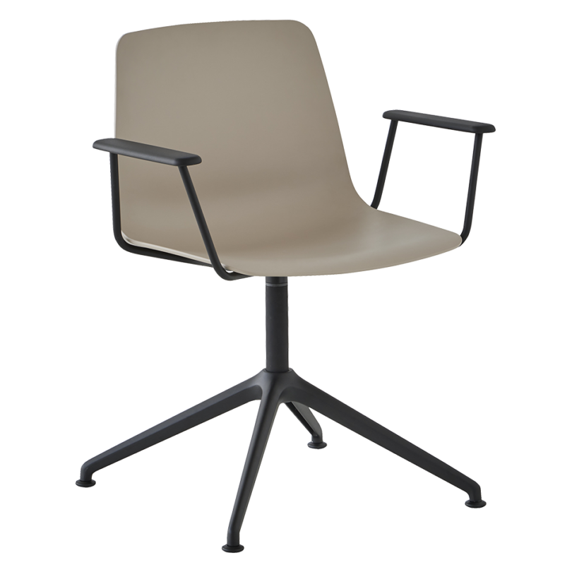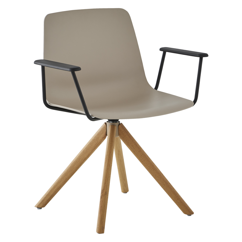 Swivel armchair with polypropylene shell, steel arms with aluminum armpads and 4 spoke swivel oak base, reinforced with an inner steel structure. Greenguard Certified.