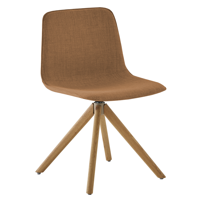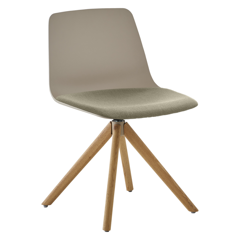 Swivel chair with polypropylene shell and upholstered seat on a 4 spoke swivel oak base, reinforced with an inner steel structure. The seat height is not adjustable. Greenguard Certified.