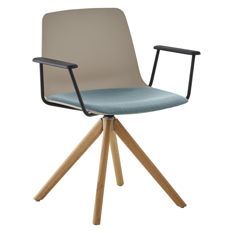 Swivel armchair with polypropylene shell and upholstered seat on a 4 spoke swivel oak base, reinforced with an inner steel structure. The seat height is not adjustable. Greenguard Certified.