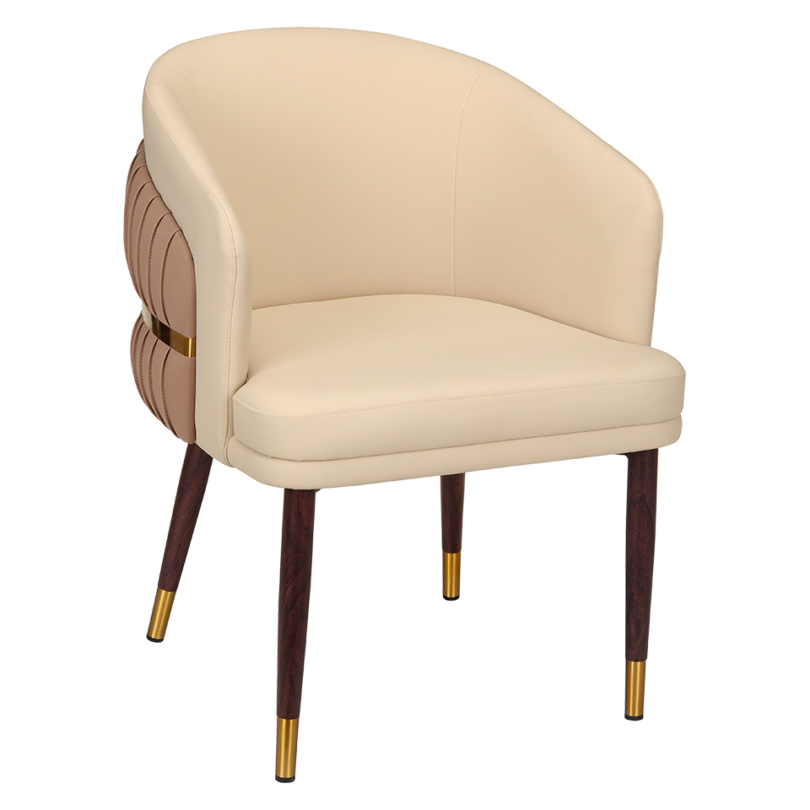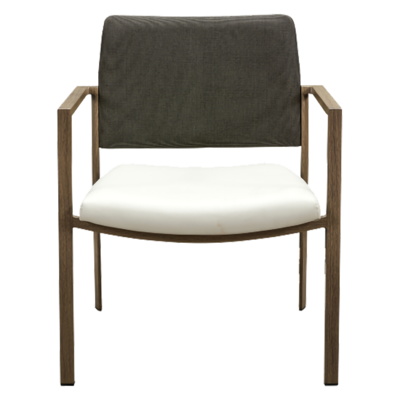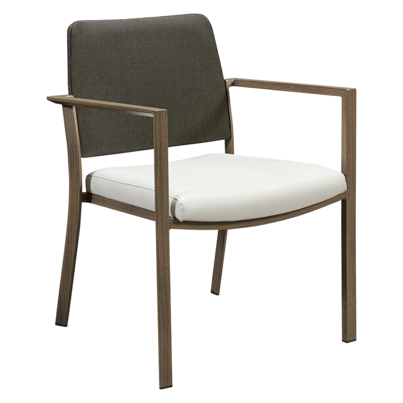 Woodlook sidechair with frame manufactured entirely from aluminum but with realistic appearance of wood.