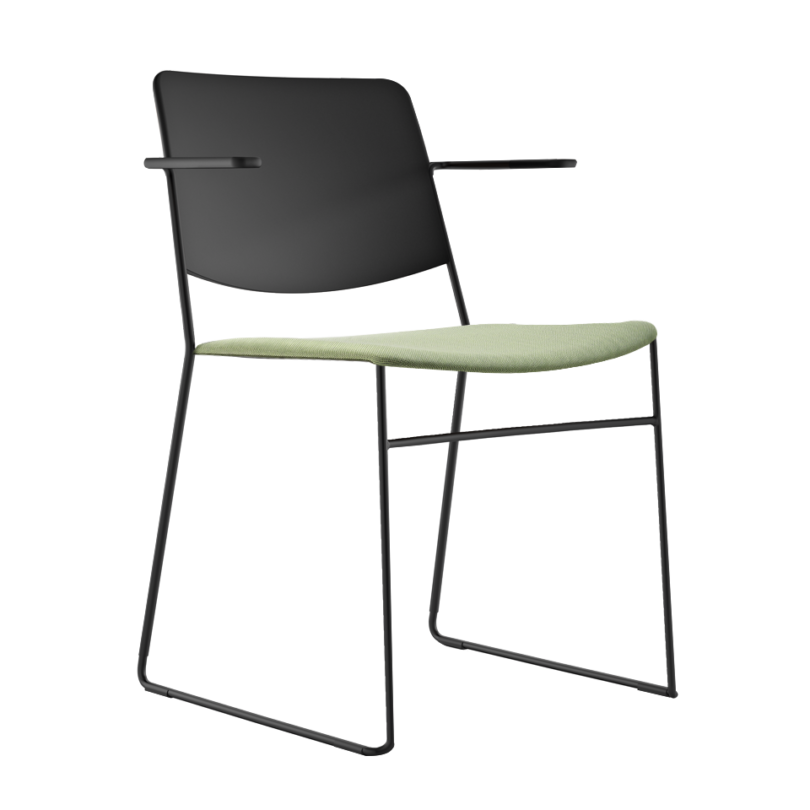 Stacking high density stacking armchair with metal frame, upholstered seat and polyolefin back. Tested to 300 lb weight load.