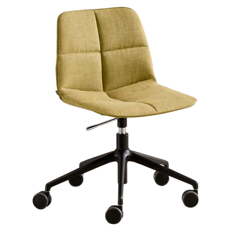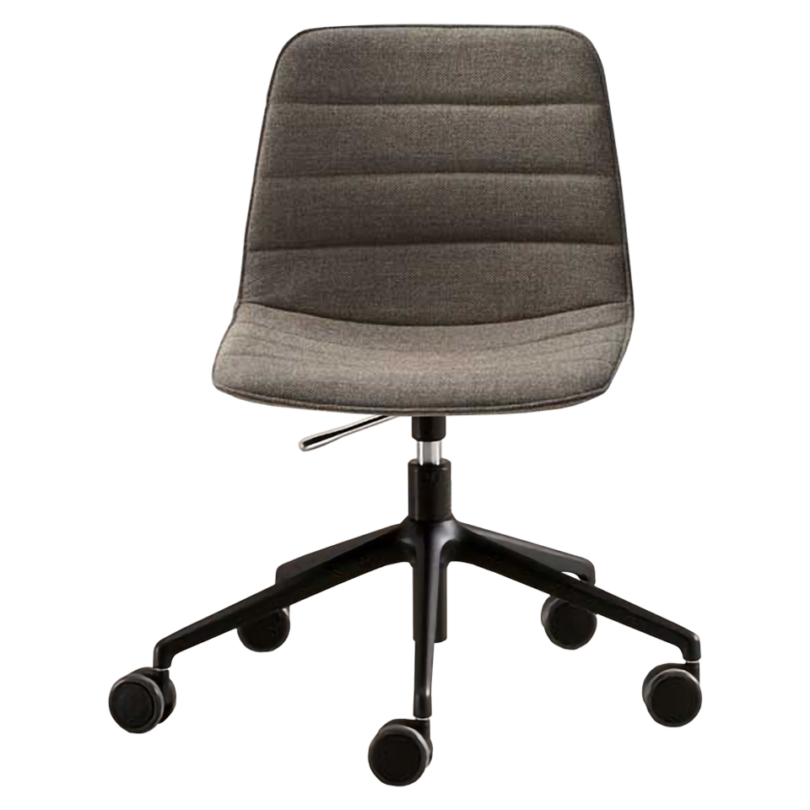 Swivel chair with horizontal stitch upholstered shell and 5 spoke cast aluminum swivel base fitted with gas lift column and Ø65mm soft tread casters. The seat height is adjustable. Greenguard Certified.