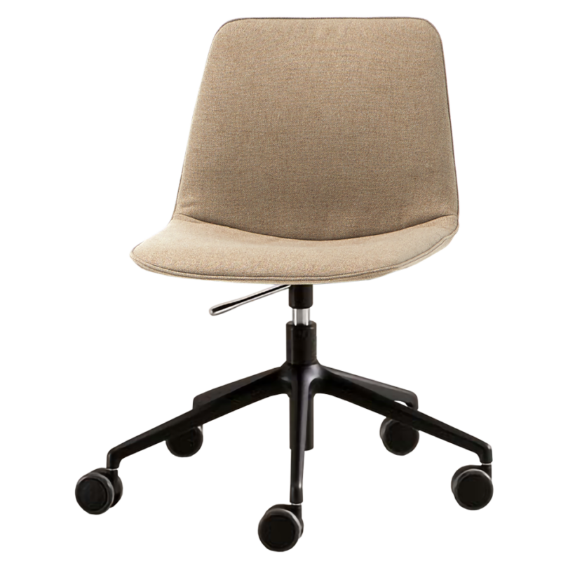 Swivel chair with loose soft fiber upholstered shell and 5 spoke cast aluminum swivel base fitted with gas lift column and Ø65mm soft tread casters. The seat height is adjustable. Greenguard Certified.