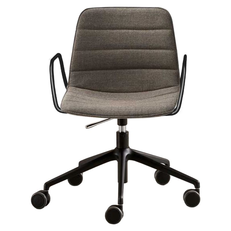 Swivel armchair with horizontal stitch upholstered shell, on a 5 spoke cast aluminum swivel base fitted with gas lift column and Ø65mm soft tread casters. The seat height is adjustable. Greenguard Certified.