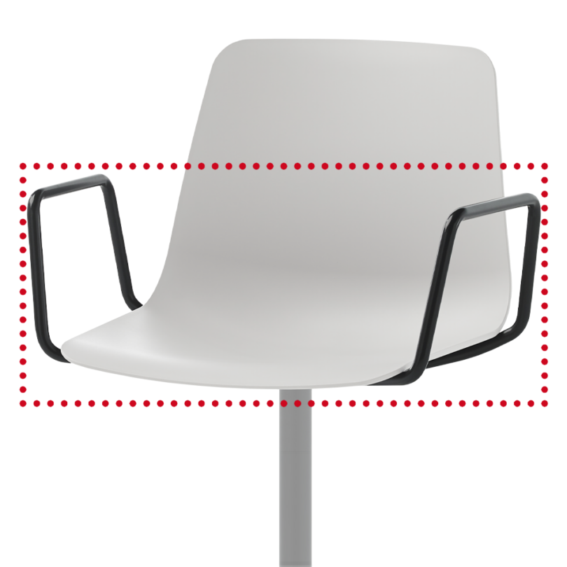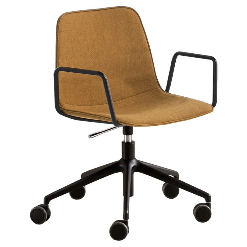 Swivel armchair with a loose fiber upholstered shell, on a 5 spoke cast aluminum swivel base fitted with gas lift column and Ø65mm soft tread casters. The seat height is adjustable. Greenguard Certified.