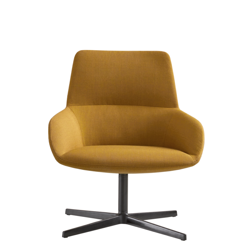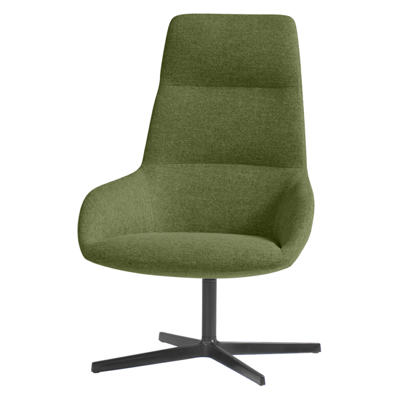 Upholstered lounge armchair with high backrest and 4 spoke aluminum self return swivel base. Greenguard Certified.