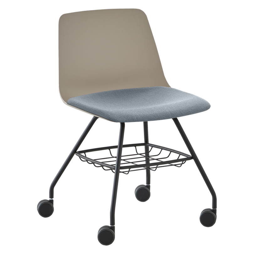 Chair with polypropylene shell and upholstered seat. Round steel tube 4 leg frame fitted with Ø65mm twin wheel swivel casters with soft tread.