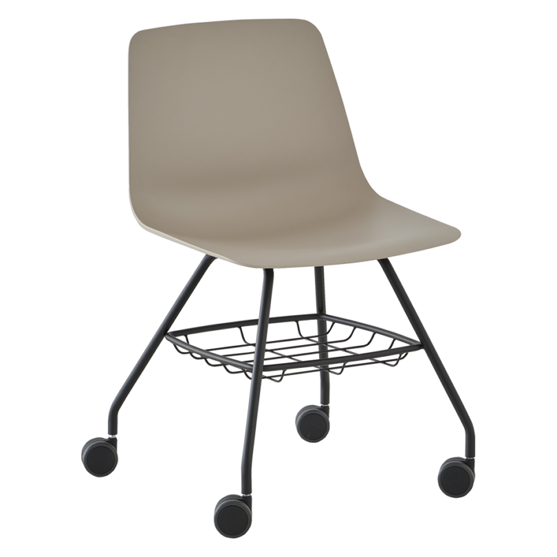 Chair with polypropylene seat shell and round steel tube 4 leg frame fitted with Ø65mm twin wheel swivel casters with soft tread.