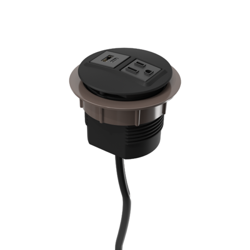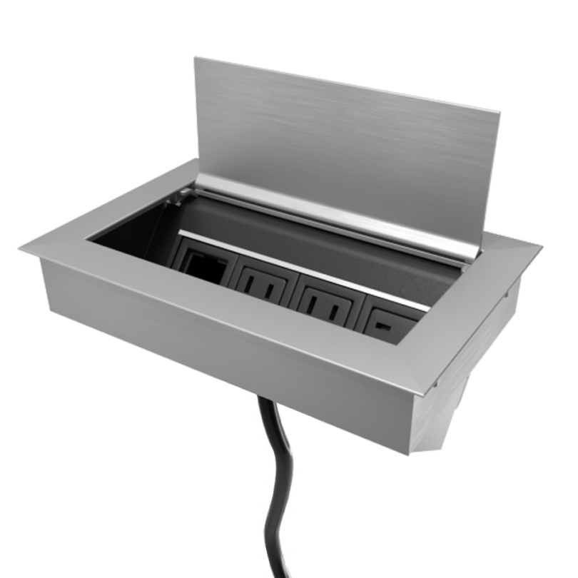 Ellora In-Surface Power/ Data box with hinged lid, 72” plug-in power cord. Four-window configuration: 2 power outlet, 1 USB-A, 1 USB-C Charger. Suitable for all Essens bases.
