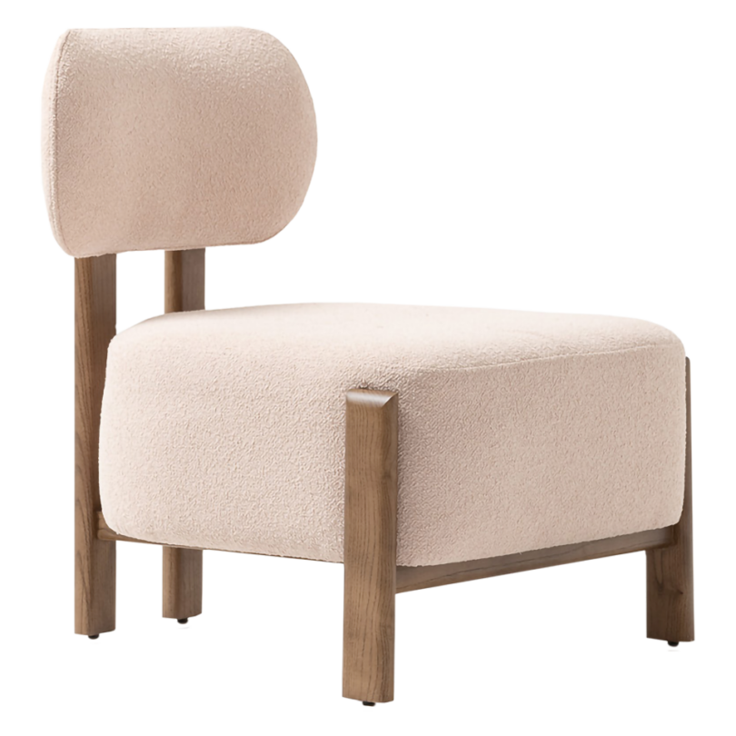 Fully upholstered sidechair on wooden swivel frame in oak or walnut.